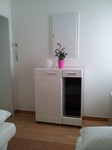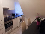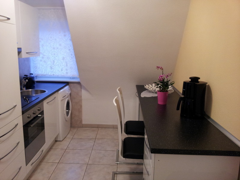 Die Einbauküche ist mit einem 4-Platten Induktionskochfeld, einem Kühlschrank mit Gefrierfach, einer Kaffeemaschine, einem Wasserkocher, Toaster und einem Mikrowellengerät ausgestattet. Es ist ausreichend Geschirr sowie Kochutensilien vorhanden. Desweiteren ist in der Wohnung eine Waschmaschine und es gehören zur Wohnungsausstattung außerdem ein Bügeleisen sowie ein Bügelbrett.