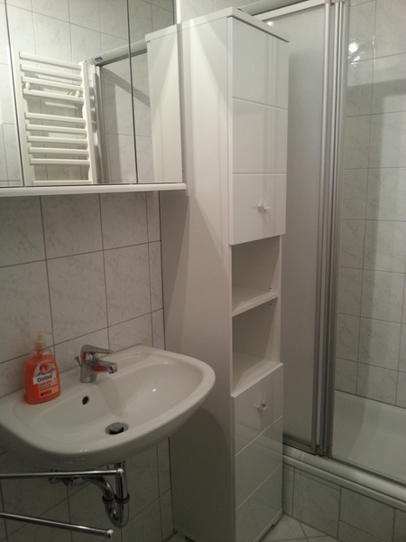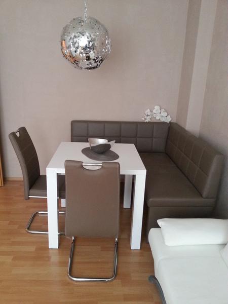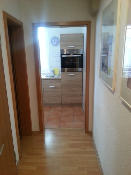 Die Einbauküche ist mit einem 4-Platten Induktionskochfeld, einem Backofen, einem Kühlschrank mit Gefrierfach, einer Kaffeemaschine, einem Wasserkocher, Toaster und einem Mikrowellengerät ausgestattet. Es ist ausreichend Geschirr sowie Kochutensilien vorhanden. Desweiteren gehören zur Wohnungsausstattung ein Bügeleisen sowie ein Bügelbrett.